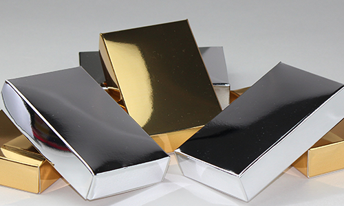 "カード紙の表面にアルミの艶消し面が出るように貼り合わせし、ゴールド印刷後、OPPフィルム貼合を施した製品です。食品容器や食品に直接触れるシートなどに使用出来ます。